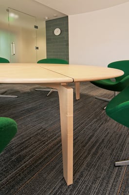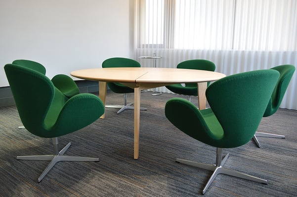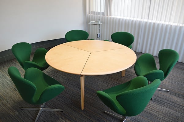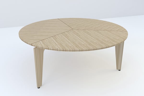 応接室のためのラウンドテーブル。6人掛けの必要寸法に合わせ、3脚の足をテーブル天板より切り離したようなデザインとしている。テーブル天板自体が独立して浮き上がってみえる柔らかな印象は、Swanチェアとマッチしたインテリアを形成している。