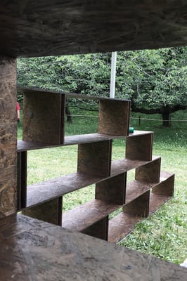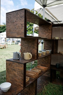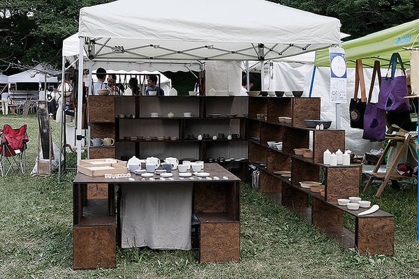 野外イベントでの展示品を販売する組み立て式の展示ユニット。棚板材と縦材を上下で少しずつずらしながら重ねていくことで、一定の強度を保ちつつ軽やかな印象を与える構成となっている。また、基本ユニットを棚板材と縦材の2つに絞ることで、搬入時に最小のボリュームとなり可搬性を最大限に高めている。
