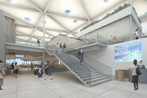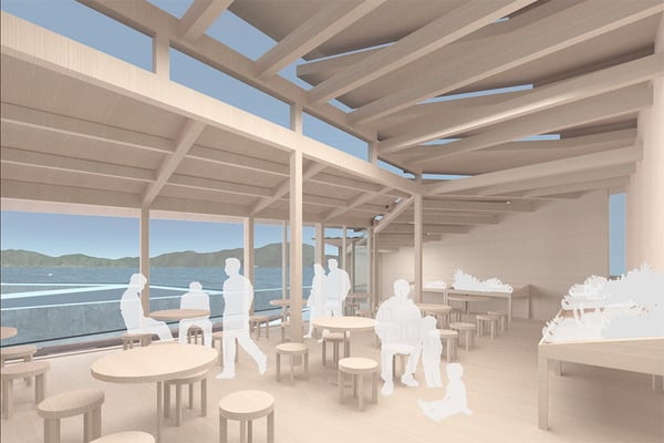 愛媛県八幡浜市沖合に位置する小島に計画した交流拠点デザイン競技案。港の景色をより積極的に楽しむため、建物の屋根全体を階段状のデッキとして計画した。訪れた人々がこの階段状デッキの好きな場所に座ることで、刻々と変化する風景をゆっくりと楽しめるようになっている。