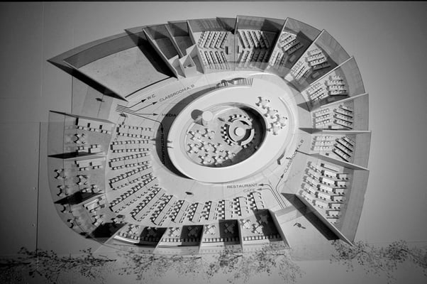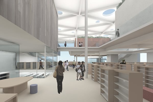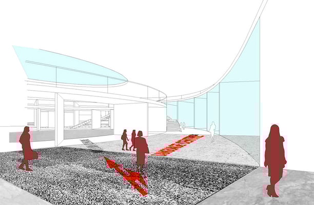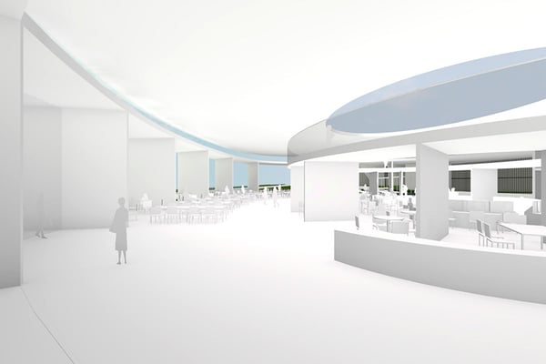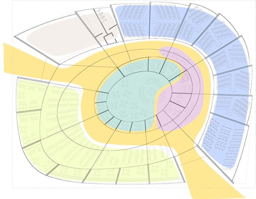 前橋市に位置する大学の新校舎建設の設計競技案。メディアライブラリーを含む教室群と、カフェテリアなどの憩いの場との共存を目指す提案となっている。キャンバスの動線を緩やかに呼び込むように円形状に計画された建物は、やや変心した環状の中央部をイベントに応じて多目的に利用可能な空間構成としている。