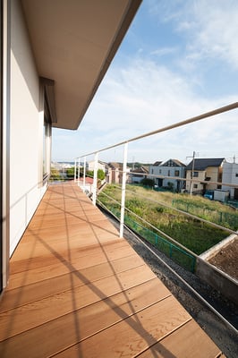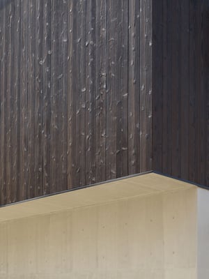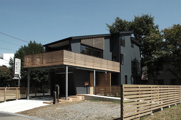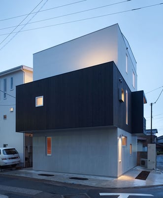 逗子の海岸からほど近い場所にある音楽教室併設の住宅。遮音性を考慮し、音楽室のある1階はコンクリート造、住居部分の2〜3階は木造としている。近くの幹線道路からの騒音を遮断するように水回りなどを配置した壁面は、焼き杉板に耐候性のある塗装を施した個性あるファサードを構成している。