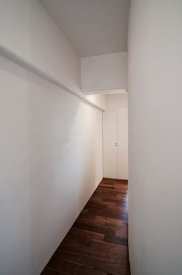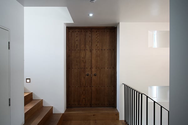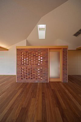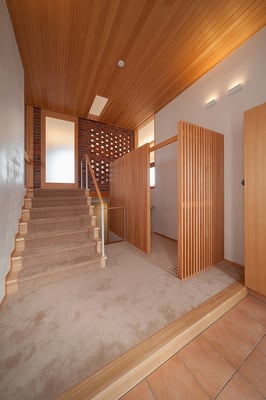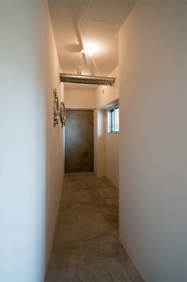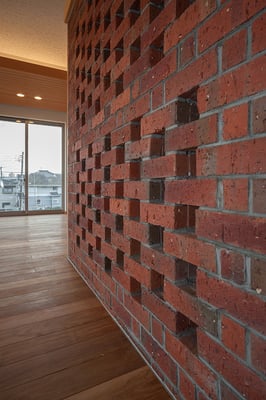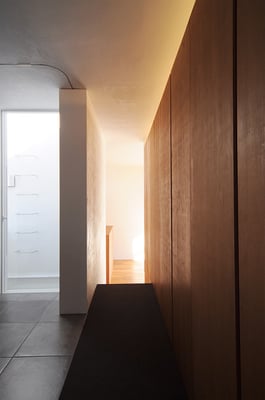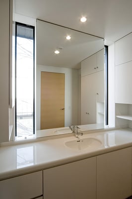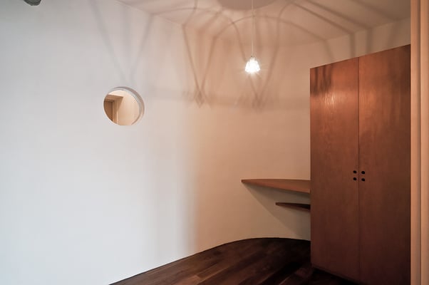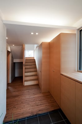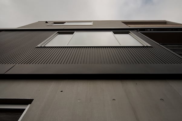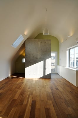 都内の3階建て住宅の密集した地域に建てられた音楽スタジオ併設の二世帯住宅。限られたスペースを最大限利用するため、主要道線はエレベーターとし、各階を移動する階段は外階段としてスペースの有効利用を図っている。建物全体を外断熱とすることで遮音性と蓄熱性を両立している。
