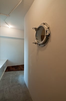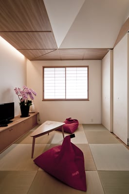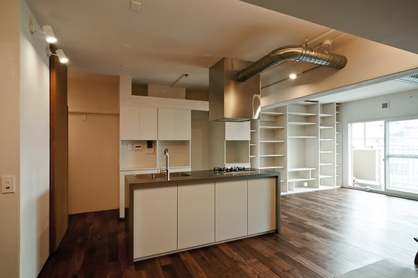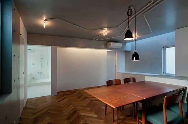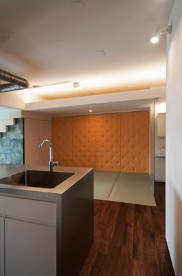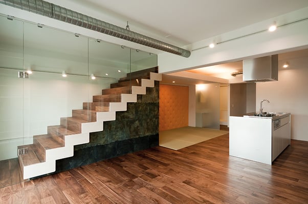 浦安市の旧江戸川沿いにある築30年近くとなる大規模マンションの一室の改修計画。大型爬虫類のペットと一緒に暮らすため、ガラスによって仕切られた階段状のペットコーナーがリビングと対峙するような計画となっている。