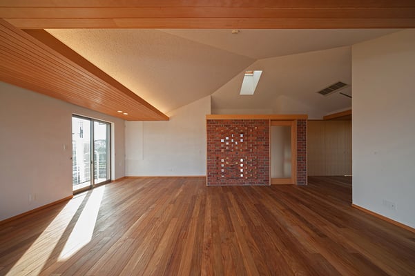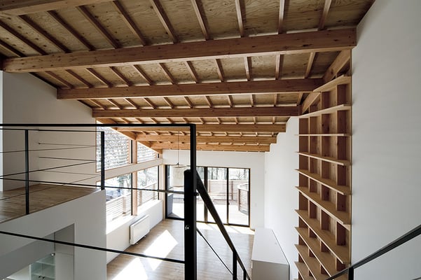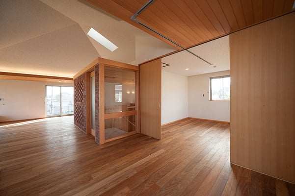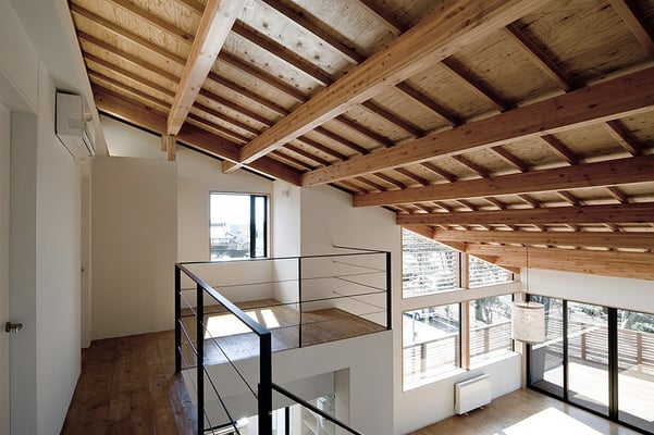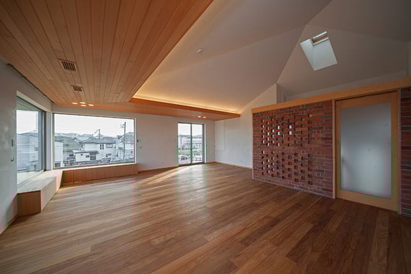 敷地前に広がる公園の景観を最大限取り込めるよう、2階にリビング・ダイニングを配置した3階建て木造高気密・高断熱住宅。外断熱とすることで、リビングの吹き抜け空間の環境を快適なものとし、天井は垂木表し仕上げとすることで、広がりのをもちつつ暖かみのある空間を提供している。