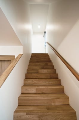 八王子市郊外の小高い丘の上が敷地となる建替計画。敷地は東に向け緩やかに下りてゆく傾斜地のため、傾斜を生かして2階へ上がる階段の中間階を玄関および水回りとし、上階をリビングダイニング、下階をベッドルームとした空間構成となっている。